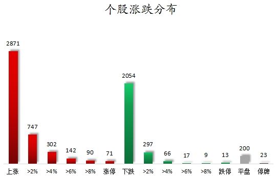 个股涨跌情况,截至收盘,沪深两市合计2871只个股上涨,2054只个股下跌,平盘个股200只,停牌的个股23只。不含当日上市新股,共有71只个股涨停,13只个股跌停。