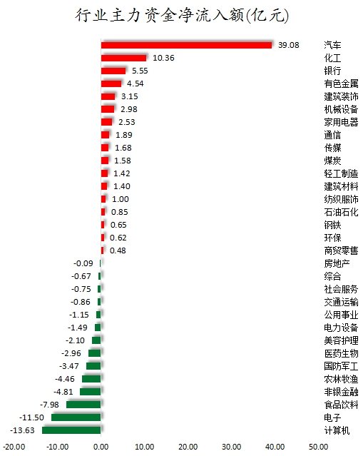 从行业来看,申万所属的31个一级行业,今日有17个行业主力资金呈现净流入,其中,汽车行业主力资金净流入最多,净流入金额为39.08亿元;行业主力资金净流入居前的还有化工、银行、有色金属、建筑装饰、机械设备等,净流入金额分别为10.36亿元、5.55亿元、4.54亿元、3.15亿元、2.98亿元。14个行业主力资金呈现净流出,其中,计算机行业主力资金净流出最多,净流出金额为13.63亿元;行业主力资金净流出靠前的还有电子、食品饮料、非银金融等,净流出金额分别为11.5亿元、7.98亿元、4.81亿元。