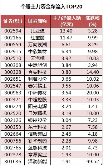 个股来看,今日有2321只个股获主力资金净流入,其中,47股获主力资金净流入超1亿元。比亚迪主力资金净流入最多,净流入金额为13.4亿元;主力资金净流入居前的个股还有红宝丽(002165)、万向钱潮(000559)、中欣氟材(002915)、天汽模(002510)、中际旭创(300308)等,净流入金额分别为11.47亿元、6.61亿元、6.34亿元、3.92亿元、3.84亿元。