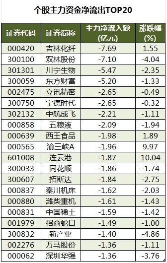 今日有2803只个股被主力资金净卖出,其中,30股被主力资金净卖出超1亿元。主力资金净流出最多的个股是吉林化纤(000420),净流出金额为7.69亿元;主力资金净流出居前的个股还有双林股份(300100)、川宁生物、东方财富(300059)、立讯精密(002475)、宁德时代(300750)等,净流出金额分别为7.1亿元、5.47亿元、5.2亿元、2.65亿元、2.65亿元。