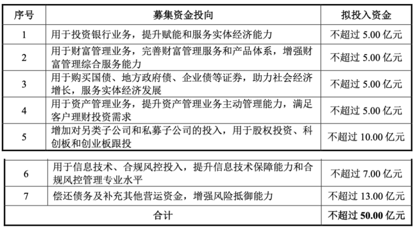 从募资投向来看,南京证券对投行、财富管理、自营、资管四大传统业务分别计划投入5亿元。其余30亿元中,有13亿元用于偿还债务及补充其他营运资金,10亿元用于增加对另类子公司和私募子公司的投入,7亿元用于信息技术及合规风控投入。