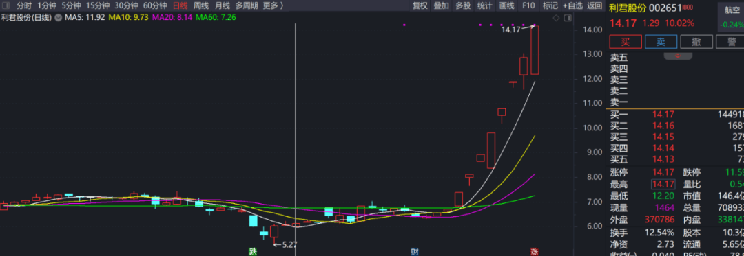 利君股份(002651)股票同样触及严重异常波动情形,最近8个交易日,曾有7个交易日触及涨停。在异动公告中,利君股份(002651)表示,公司主营粉磨系统及其配套设备制造业务和航空航天零部件制造业务,其中航空航天零部件制造业务产品主要运用于军用、民用航空航天零部件制造,“近期由于国际地缘政治环境变化,国内资本市场对中国主机厂军用战机相关概念股票关注度较高,公司股票可能存在炒作军工概念、大飞机概念、航天概念、军民融合概念等”。