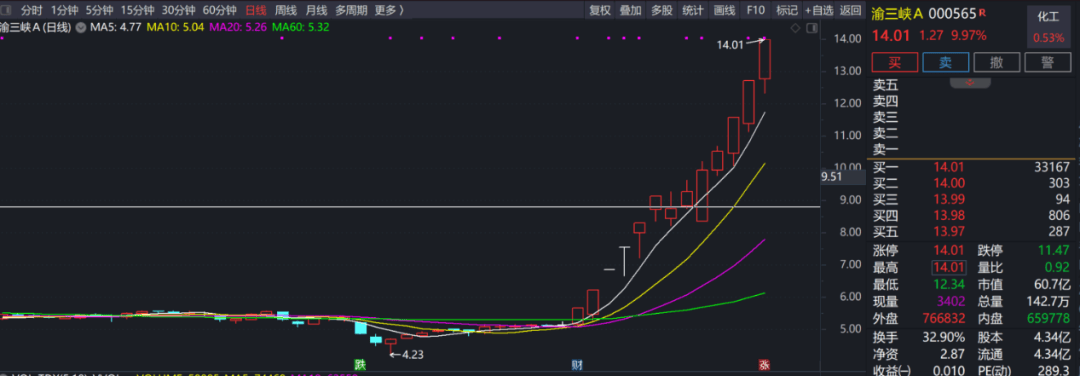 渝三峡A(000565)最近13个交易日有9个交易日触及涨停。该公司也在异动公告中表示,目前公司股票短期内涨幅较大,提示投资者合理判断公司价值。