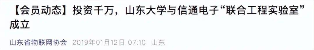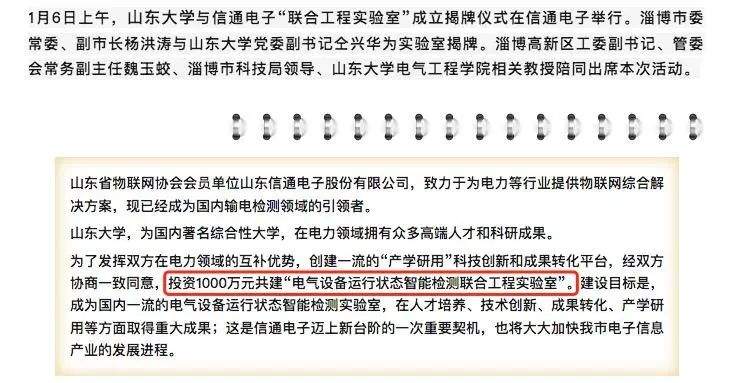 据山东省物联网协会公开消息,2019年1月6日,山大与山东信通电子股份有限公司(下称:信通电子)成立“联合工程实验室”,揭牌仪式在信通电子举行。该消息指出,联合工程实验室获得山大与信通电子的1000万元投资,将发挥校企双方在电力领域的互补优势,成为一流的“产学研用”科技创新和成(002001)果转化平台。