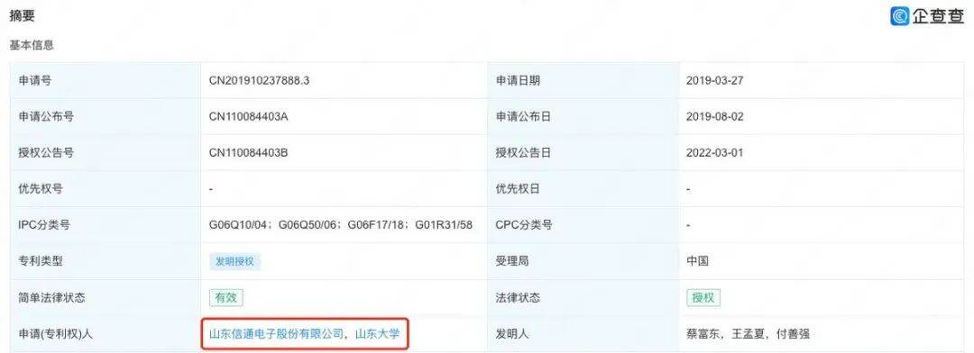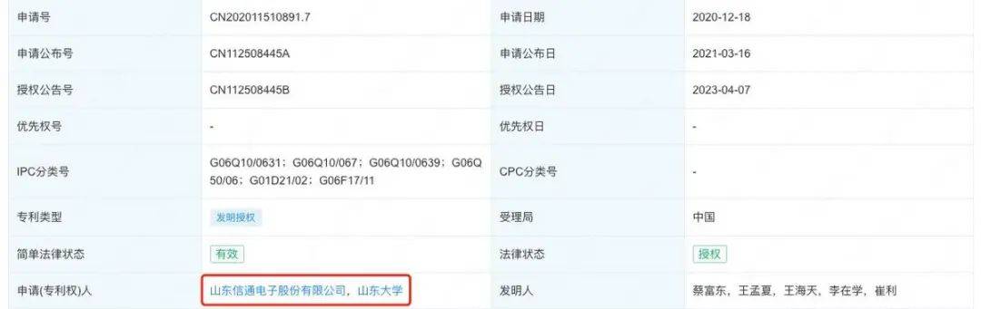 截至2024年底,信通电子与山大有两项共有发明专利,分别申请于2019年3月和2020年12月。