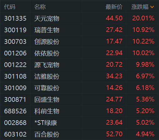 A股宠物经济股强势,天元宠物连续2日20cm涨停创新高!瑞普生物、创源股份涨超10%,源飞宠物、依依股份涨停